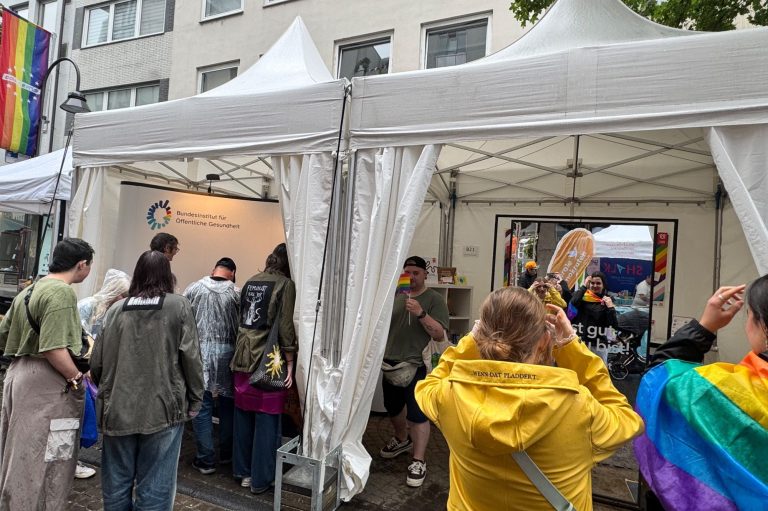 Bei dem ColognePride präsentierten wir für das BIÖG (Bundesinstitut für Öffentliche Gesundheit) Themen der sexuellen Gesundheit, der HIV- und STI-Prävention mit dem Schwerpunkt Schutz vor Konversionsbehandlungen (Abteilung T3: Sexuelle Gesundheit, Prävention von HIV und anderen STI).